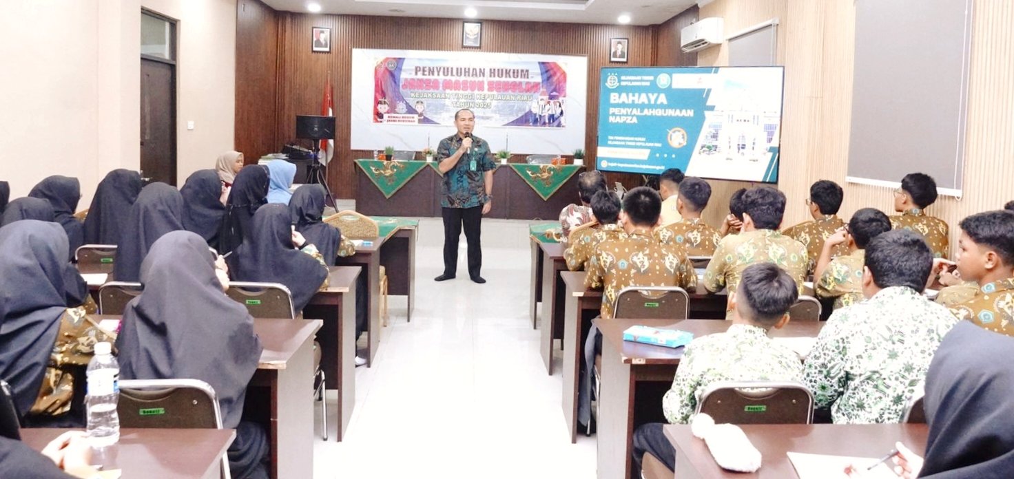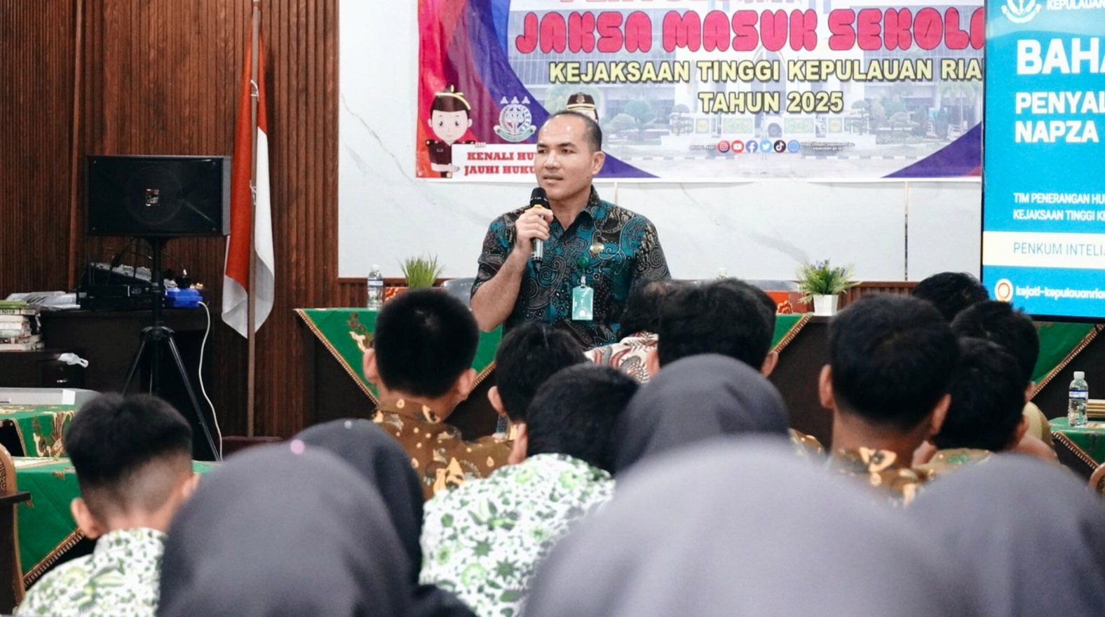 Kejati Kepri | BENEWS – Batam, Kejaksaan Tinggi Kepulauan Riau melalui Program Pembinaan Masyarakat Taat Hukum (BINMATKUM) pada kegiatan Penyuluhan Hukum kembali menggencarkan kegiatan Program Jaksa Masuk Sekolah di Madrasah Tsanawiyah Negeri 1 Batam dengan mengangkat tema tentang “Pencegahan Penyalahgunaan dan Peredaran Gelap Narkotika, Psikotropika dan Zat Adiktif Lainnya (Napza) serta Anti Perundungan (Bullying) dan Bijak Bermedia Sosial”. Kegiatan ini dilaksanakan dalam rangka pembentukan revolusi mental karakter dan peningkatan kesadaran hukum anak bangsa merupakan generasi penerus bangsa, Kamis (02/10/2025).