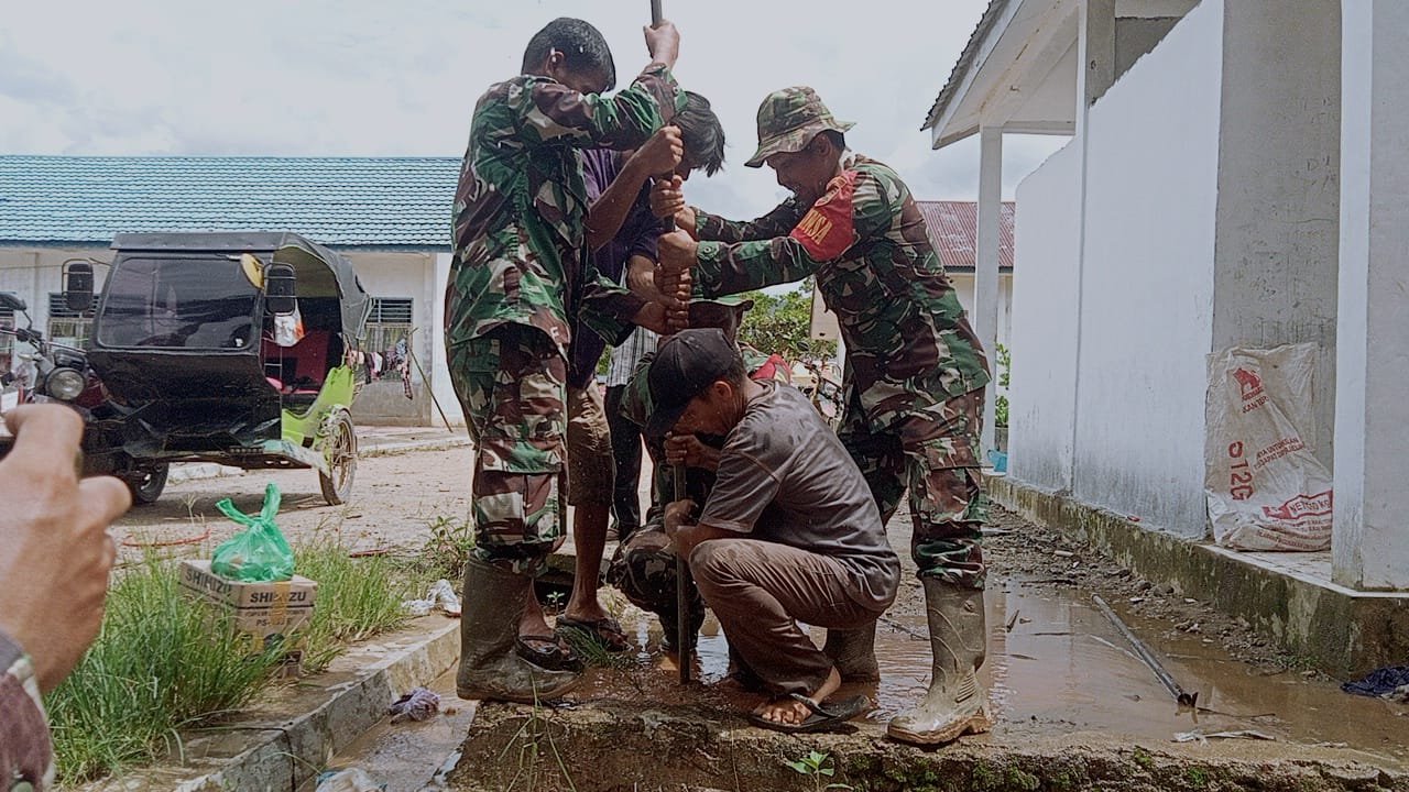 Kodim 0211/Tapanuli Tengah melaksanakan pembuatan sumur bor untuk memenuhi kebutuhan air bersih bagi warga pengungsi yang berada di SMA Negeri 1 Tukka, Kecamatan Tukka,
